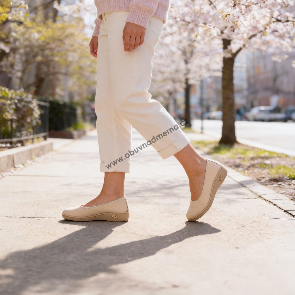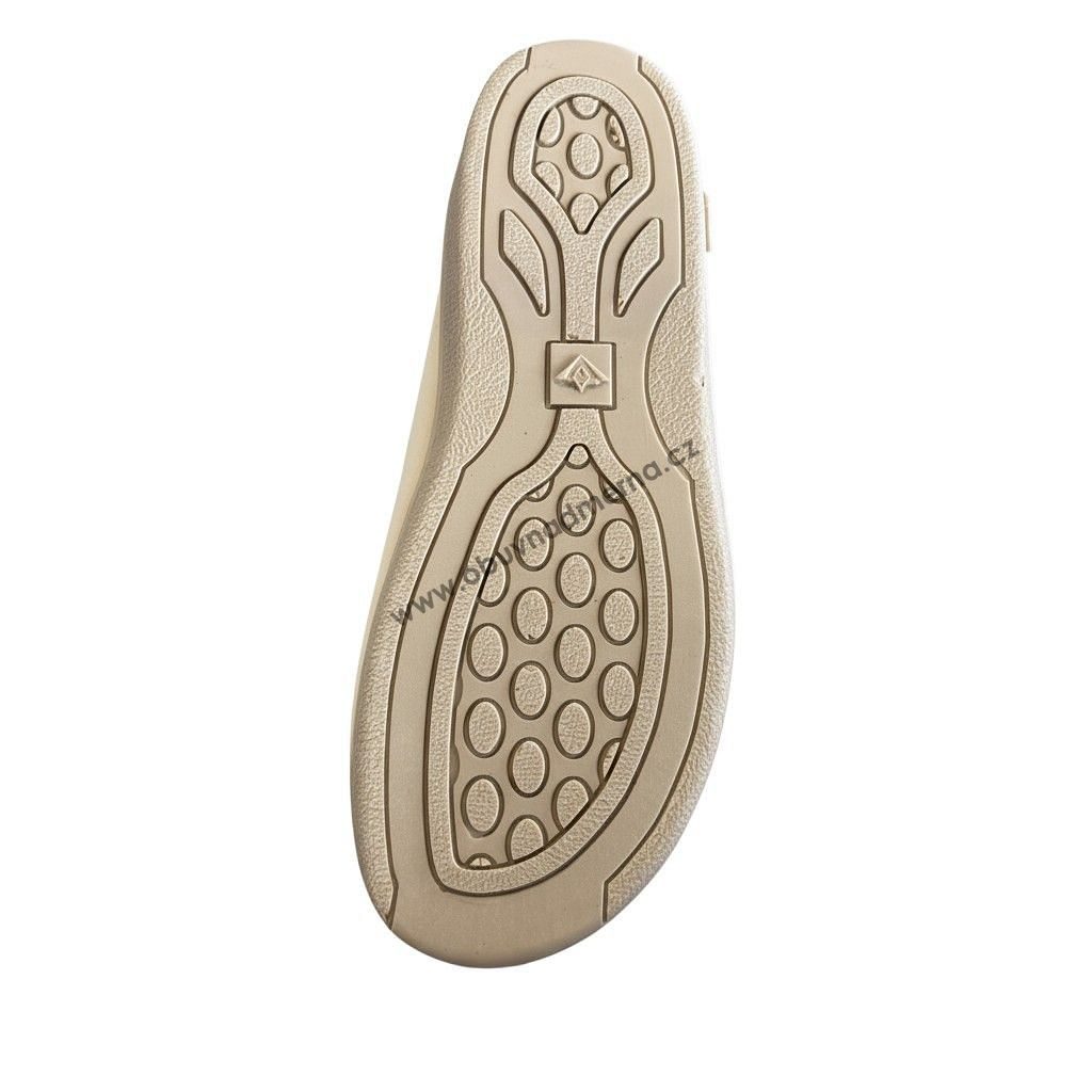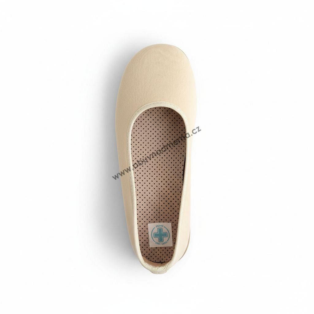 Otevřenější, mimořádně prostorný střih dává chodidlu maximální volnost. Měkký pružný materiál se přizpůsobí i výrazným tvarovým změnám chodidla. Velmi široce řešená pata zajišťuje pohodlí i ženám, kterým běžné baleríny v zadní části vůbec nesedí.