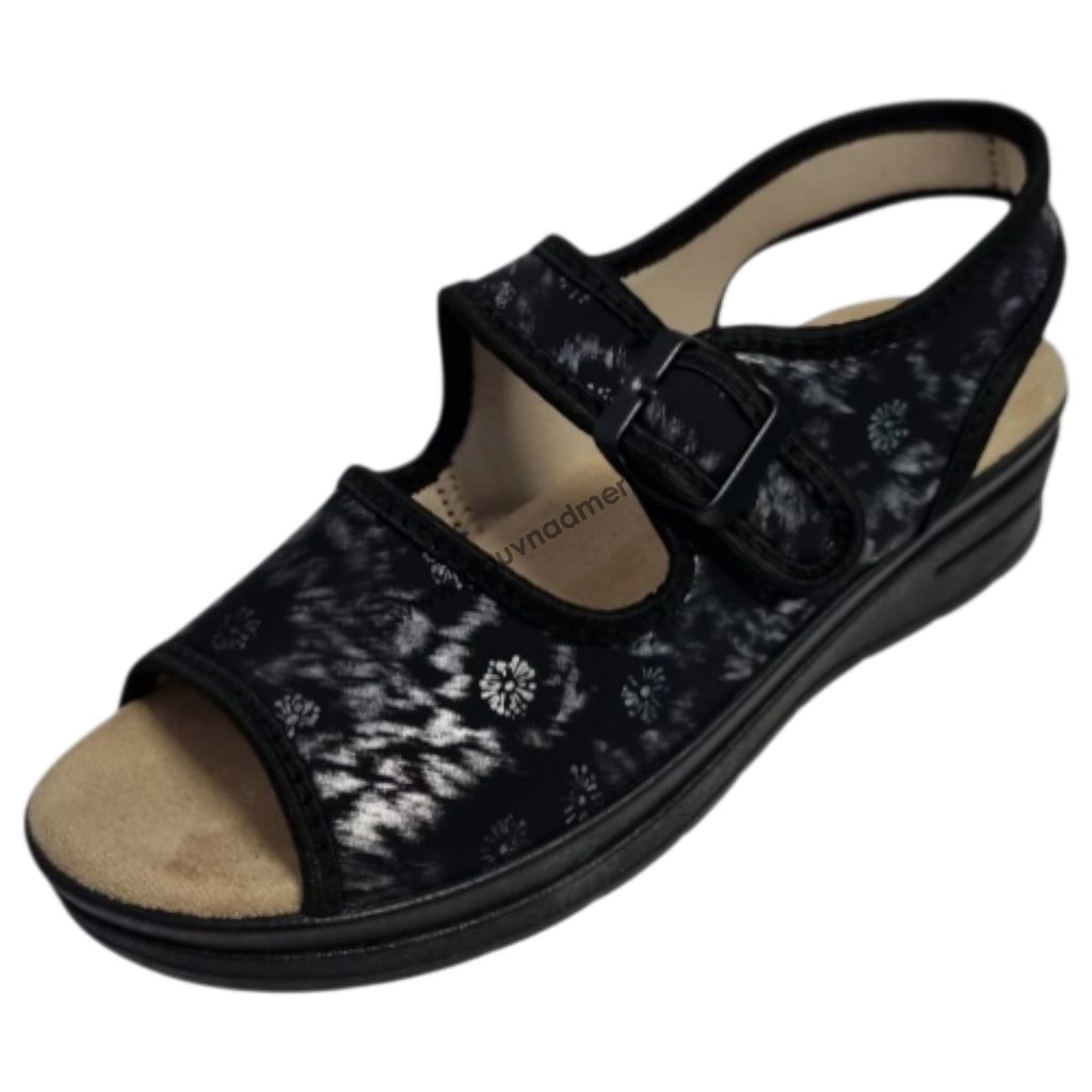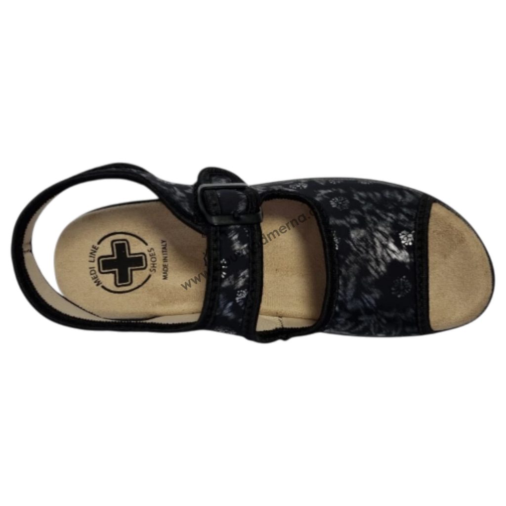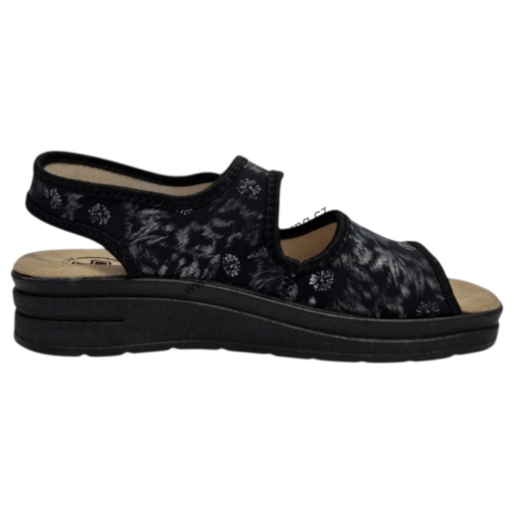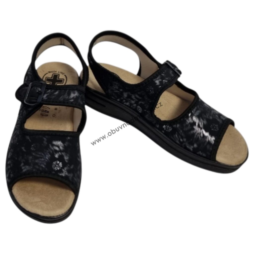Dámské sandály Mediline z pružného materiálu lycra se přizpůsobí i citlivým a deformovaným chodidlům. Jsou vhodné zejména při halluxech, kladívkových prstech nebo při lymfatických otocích v oblasti paty či kotníku.
