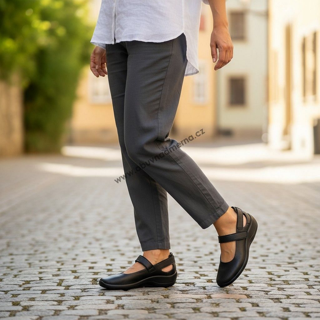 Lehké a elastické baleríny Arcopedico s páskem přes nárt a za patu, vhodné na široká chodidla, vbočené palce (hallux valgus).