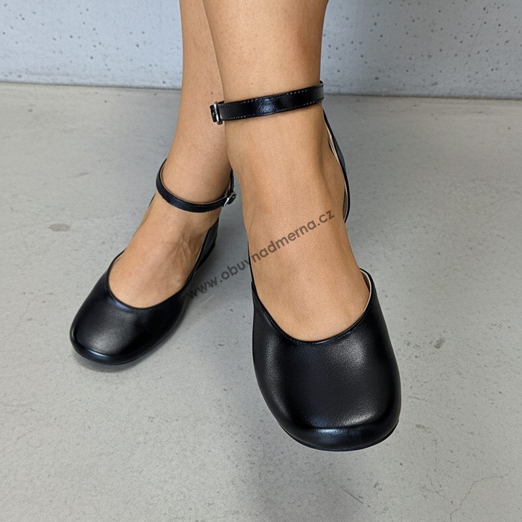 Lodičky De Plus, široká špička, na široké chodidlo, na hallux, šíře H, měkčená kožená stélka, kožené, na podpatku, otevřená vnitřní strana, pásek kolem kotníku s přezkou.