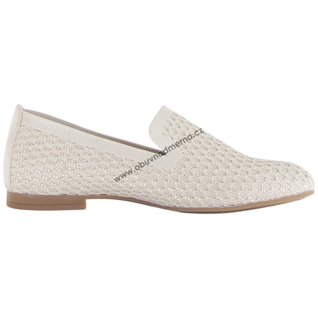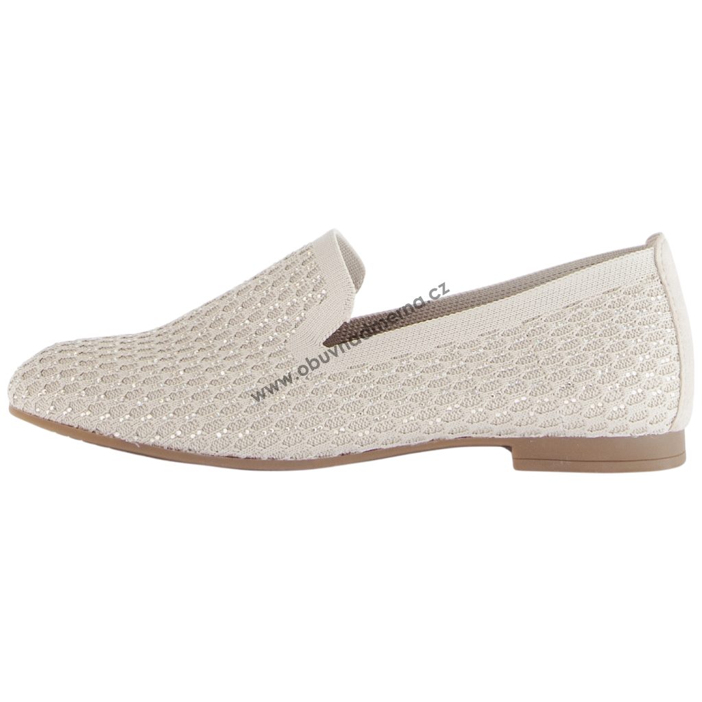 Mokasínový střih s užší špičkou dobře sedí na standardní až lehce užší chodidlo. Prostřihy po stranách nártu usnadňují obouvání a zároveň dodávají botám vzdušnost. Jemná béžová barva je ozvláštněná drobnými štrasovými kamínky, které modelu dodávají nenápadný elegantní detail.